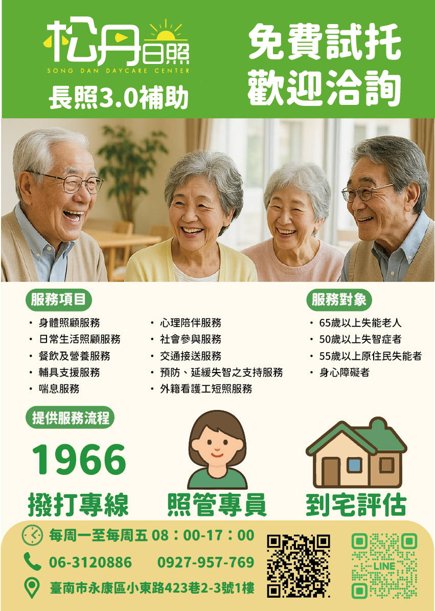 若尚未申請長照服務,請撥打 1966,由臺南市衛生局長期照護科安排照管專員進行到宅評估,確認是否符合日間照顧中心的補助資格與額度。✔️ 我們可協助說明申請流程與提供聯絡窗口。